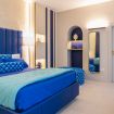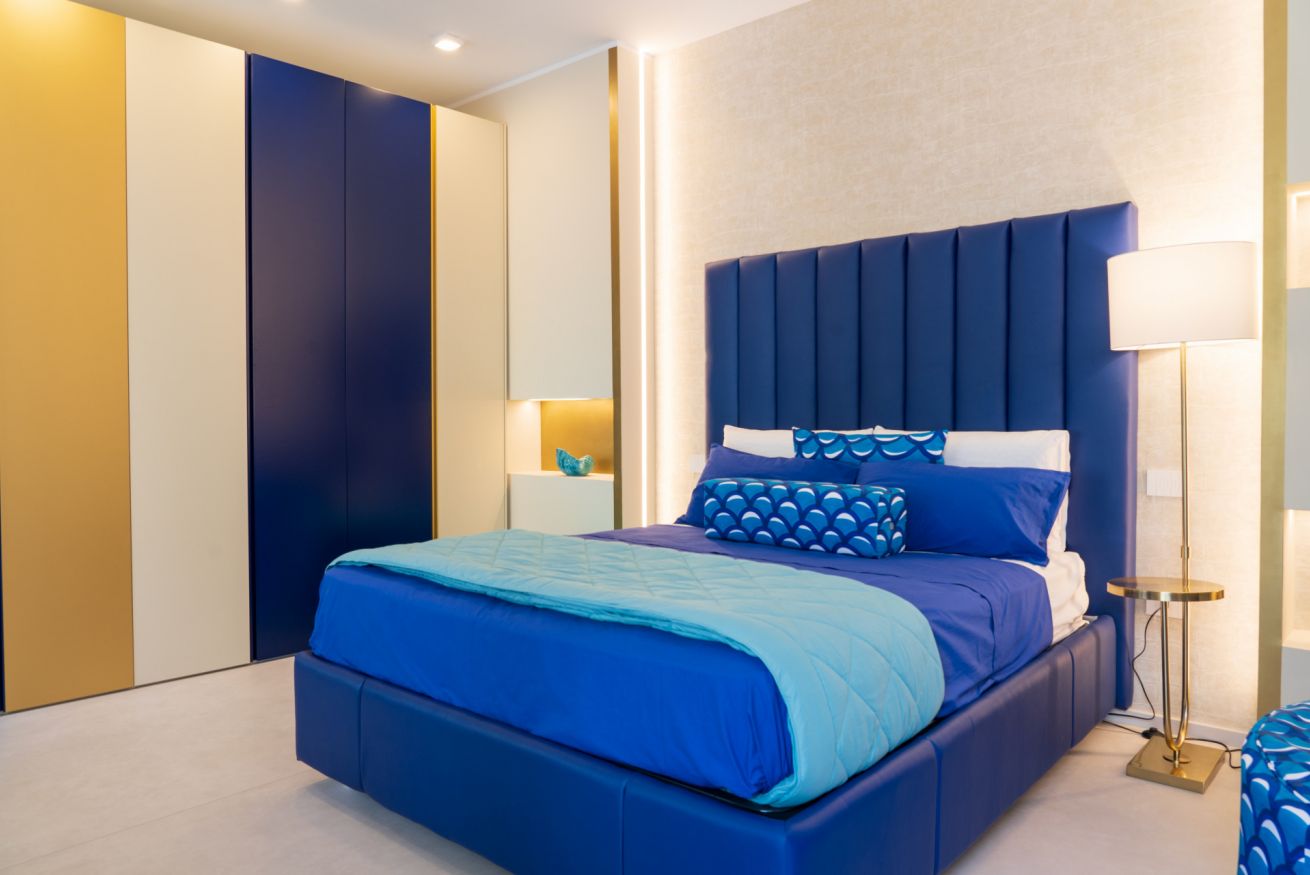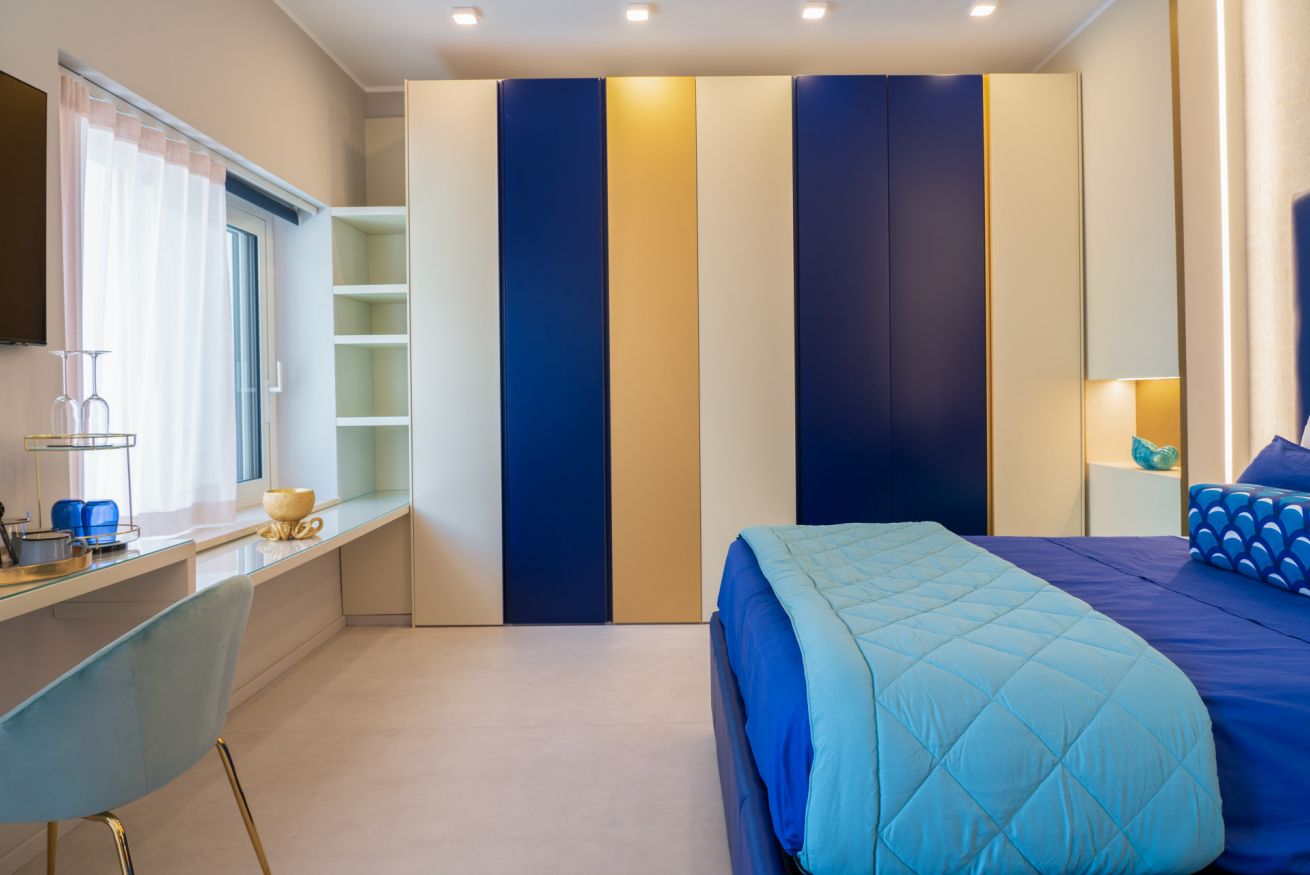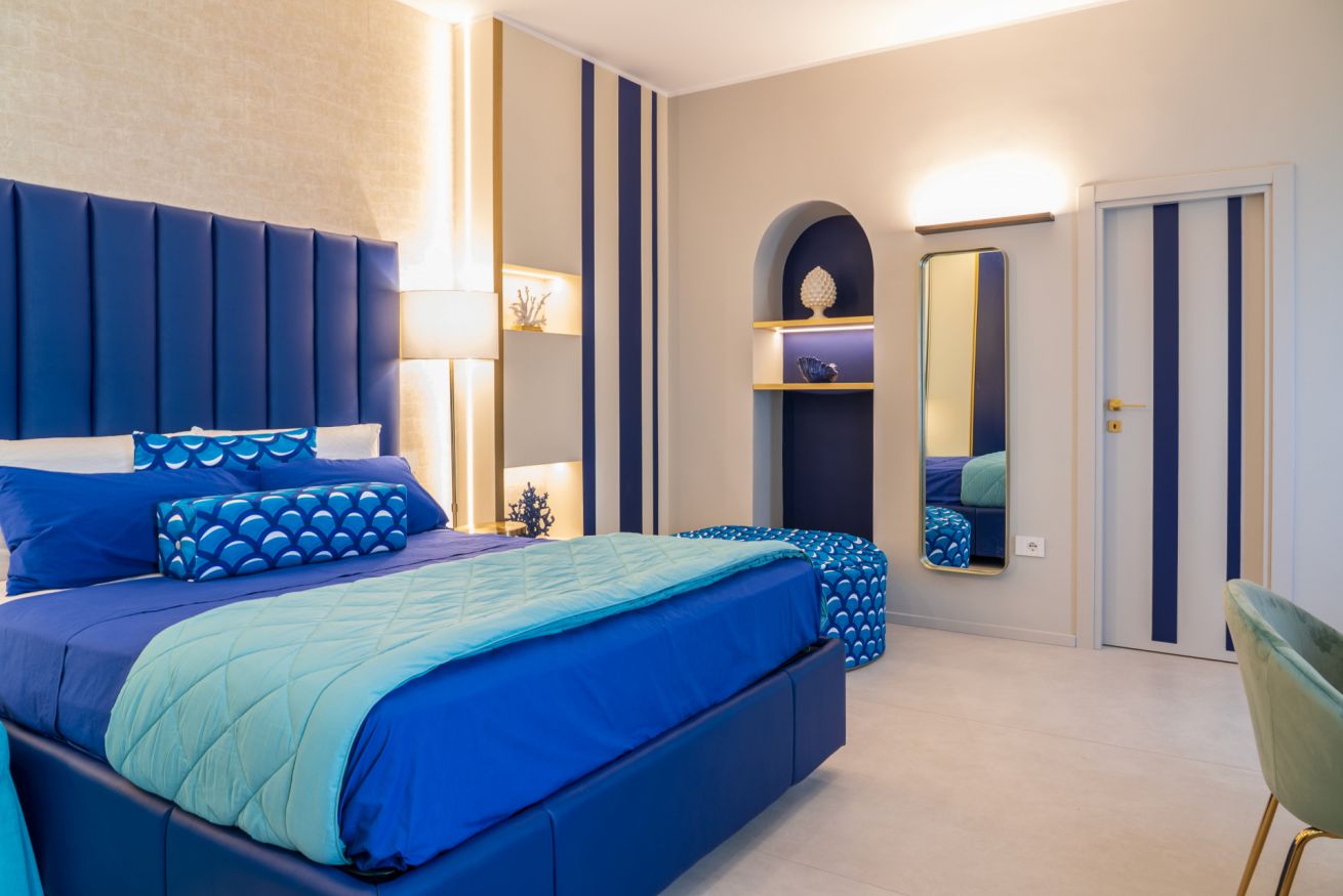 Pareti e pavimenti chiari, si fondono, nelle mille tonalità del blu, in un raffinato gioco di colori e di design.