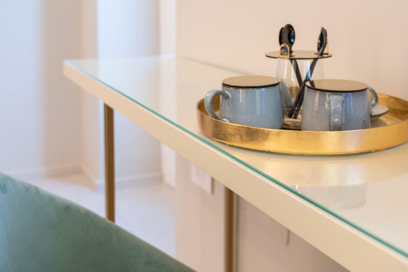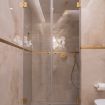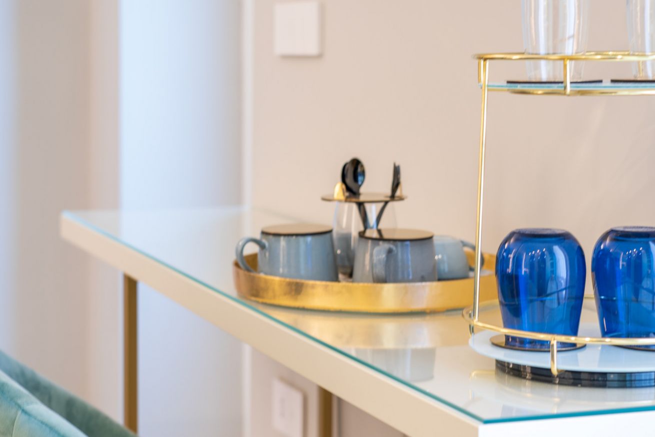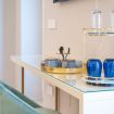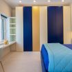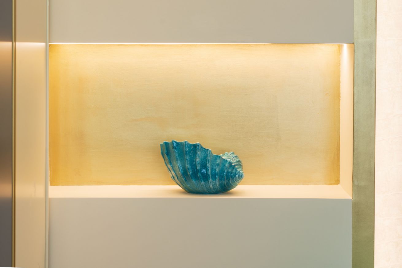 Pareti e pavimenti chiari, si fondono, nelle mille tonalità del blu, in un raffinato gioco di colori e di design.